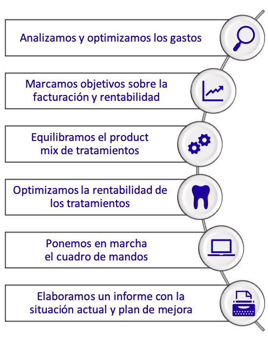 Una vez realizado el análisis de tu clínica dental, presentaremos el PLAN DE ACCIÓN que ejecutaremos en colaboración con tu equipo. Aplicaremos las herramientas necesarias para aumentar aspectos tan importantes para tu clínica como la facturación, la rentabilidad y la optimización de recursos. Para conseguirlo impulsamos un plan de marketing dental & comunicación que se comienza a implementar desde el primer día.